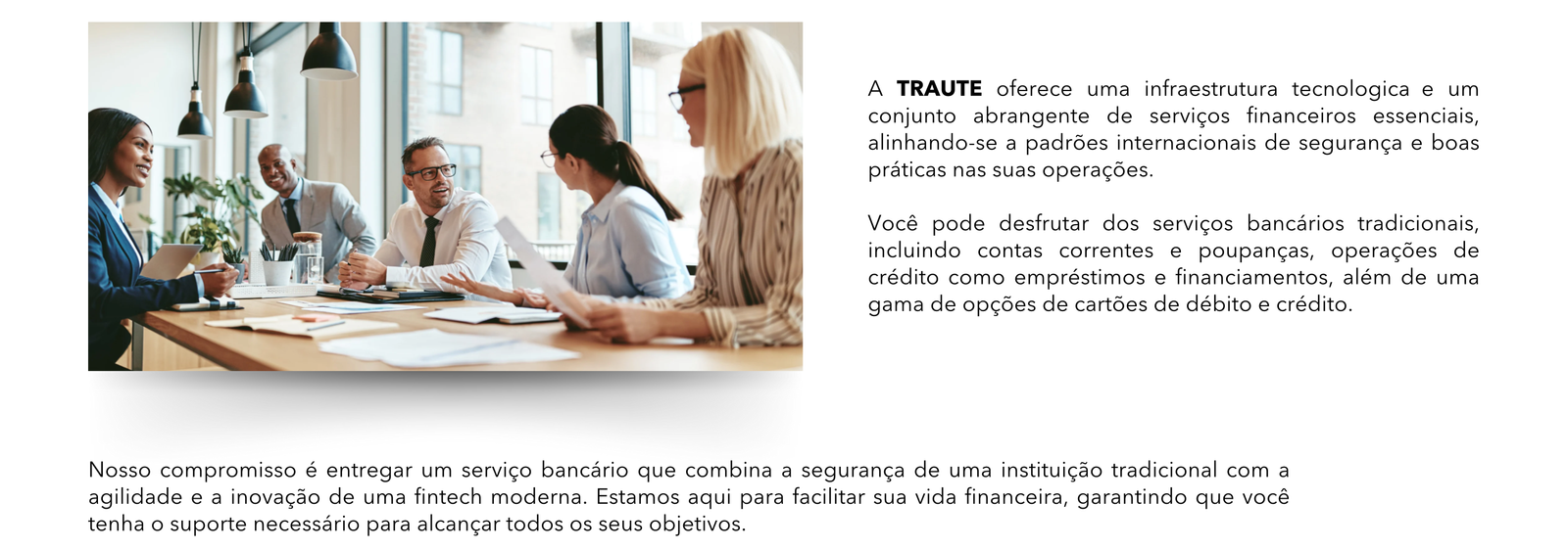 Com automação avançada e digital, disponibilizamos serviços inovadores que simplificam a vida financeira de nossos clientes, oferecendo um atendimento exclusivo, moderno e inovador, sem as burocracias e complicações dos bancos tradicionais.